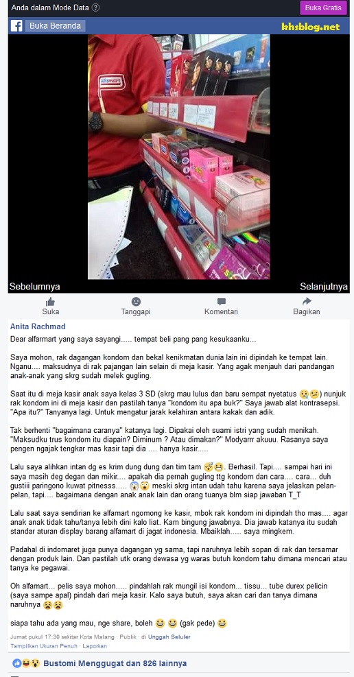Salah seorang warganet di Malang menyampaikan kegundahan akan keberadaan kondom dekat kasir toko ritel ini pada laman facebooknya pada tanggal 9 Maret 2018. Monggo disimak mantemans…