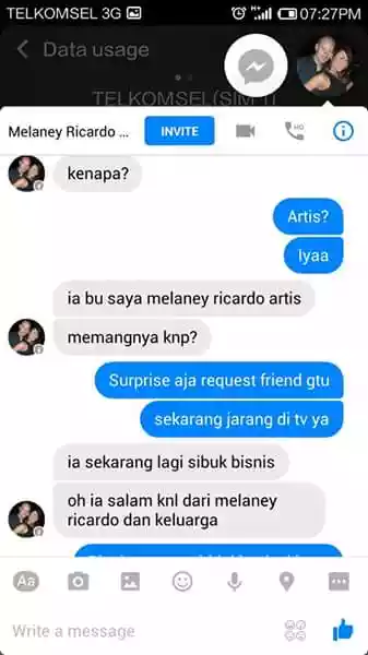“Temans, yang punya balita ..barusan aku di add oleh akun yang bernama MELANEY RICARDO LYNCH dan akun tersebut mengaku ngaku artis ….