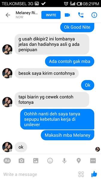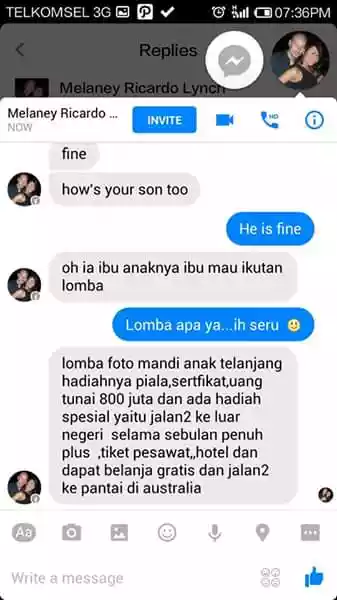 Dari screenshot chatting yang dilampirkan yakni akun palsu ini menggunakan akun artis Melanie. Sedangkan lomba-lomba bayi telanjang dengan berbagai pose itu diiming-imingi dengan hadiah uang ratusan juta dan pesiar keluar negeri.
