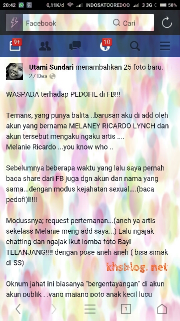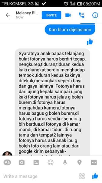 Sebelumnya beberapa waktu yang lalu Utami sudah pernah baca share dari FB juga dengan akun dan nama yang sama yakni modus kejahatan sexual….(baca pedofi)l!!!! “Modussnya; request pertemanan…(aneh ya artis sekelass Melanie meng add saya…) Lalu ngajak chatting dan ngajak ikut lomba foto Bayi TELANJANG!!!! dengan pose aneh aneh ( bisa simak di SS)” tambahnya ibu yang tinggal di Bogor ini.