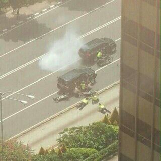 “Jangan ada yg keluar kantor dulu guys, ada terios hijau sama motor trail bawa2 ak 47 nembak