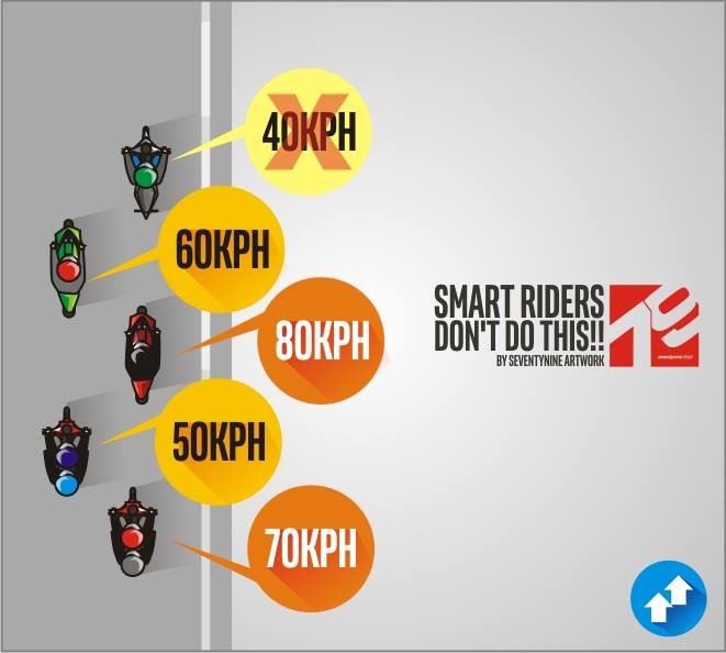 - Jangan berada dijalur cepat bila kecepatan kita sedang lambat. Berkendara sepeda motor itu bisa di ibaratkan sekumpulan ikan di laut, mereka memiliki ritme dan pola pergerakan yang tersinkronisasi, tanpa sadar rider yang sudah berpengalaman dengan mudah masuk atau mengikuti pola tersebut, namun rider2 yang baru masuk atau baru bisa membawa kendaraan pasti akan “ragu2” dalam setiap pergerakan sehingga tidak tersinkronisasi dengan sekitarnya.Seperti gambar diatas kadang ada rider yang berjalan lebih pelan di jalur cepat, di luar kerumunan atau sekelompok itu jika ada ikan yang lebih lambat, pasti akan menggangu ikan2 yang lebih cepat, jadi jika Anda lebih lambat dari yang lain tolong jangan sampai menggangu rider yang lain, dan jiga Anda lebih cepat dari rider2 lain jangan juga menggangu rider lain “be fast but smart”.