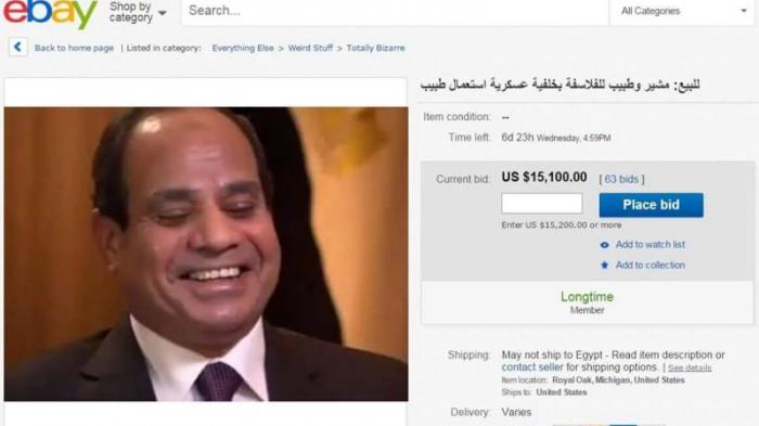 Presiden Mesir, Abdel Fattah El-Sisi dijual di situs jual beli eBay. Sebenarnya bukan sesuatu yang mengagetkan karena di situs eBay sering pula dijual hal-hal aneh, nyleneh dan unik lain. Namun menjual presiden ini sepertinya merupakan pengalaman pertamax di situs jual beli ini. Sebuah akun dr motown inilah yang menjual presiden mesir ini pada tanggal 24 Pebruari 2016.