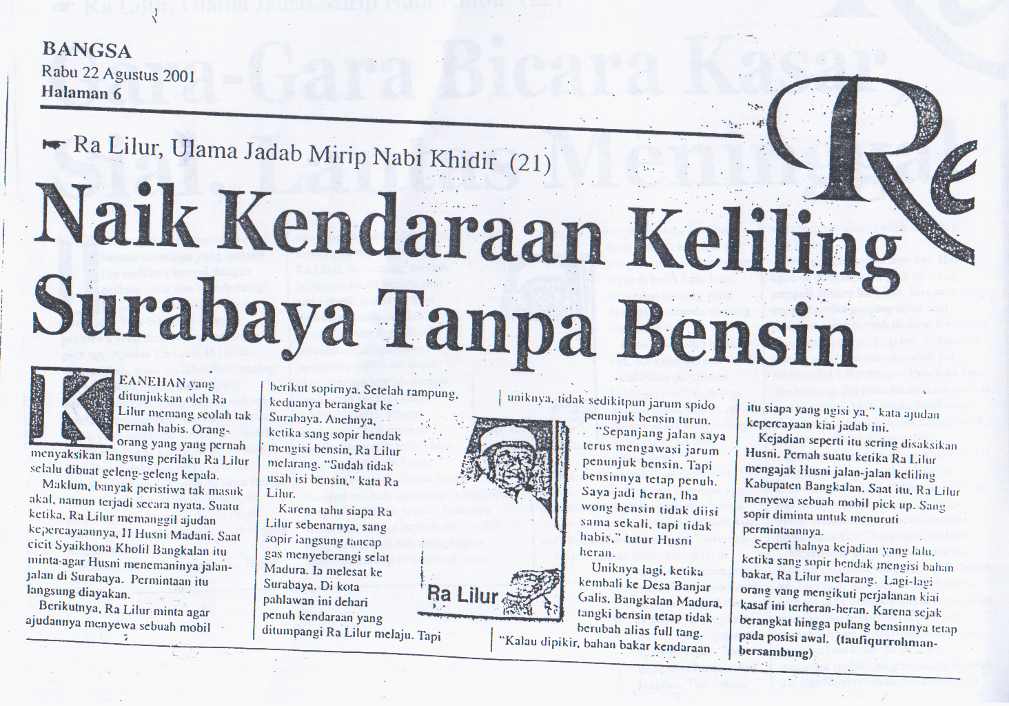 Berikutnya, Ra Lilur minta agar ajudannya menyewa sebuah mobil berikut sopirnya. Setelah rampung, keduanya berangkat ke Surabaya. Anehnya, ketika sang sopir hendak mengisi bensin, Ra Lilur melarang. “Sudah tak usah isi bensin,” kata Ra Lilur. Karena tahu siapa Ra Lilur sebenarnya, sang sopir langsung tancap gas menyeberangi Selat Madura. Ia melesat ke Surabaya. Di kota pahlawan ini sehari penuh kendaraan yang ditumpangi Ra Lilur melaju. Tapi uniknya, tak sedikitpun jarum spido penunjuk bensin turun.