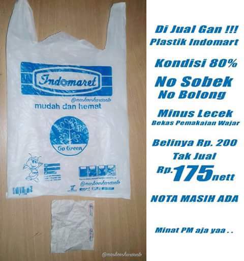 Sempat heboh dengan kebijaksanaan pemerintah Indonesia untuk menerapkan plastik berbayar atau diet plastik di toko-toko ritel di Indonesia. Kebijakan ini menimbulkan pro dan kontra di kalangan masyarakat dengan argumen, pandangan serta persepsi masyarakat. Nah kali ini muncul meme jual kresek bekas toko ritel tersebut dengan harga yang lebih murah….wkwkwkwk.