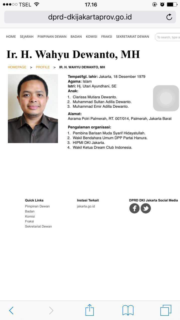 Publik dihebohkan dengan adanya Surat dari Sekjen KemenPAN RB yang meminfa fasilitasi untuk Sdr. Wahyu Dewanto Suripman, kolega Yuddy Chrisnandi ketika akan berkunjung ke Australia. Surat bernomor : B/1337/S.PANRB/03/2016 tertanggal 22 Maret 2016 tersebut ditujukan kepada Sekjen Kementerian Luar Negeri dengan tembusan MenPANRB, Dubes RI di Australia dan Konjen RI di Sidney. Nah berikut profil dari Sdr. Wahyu Dewanto Suripman, anggota DPRD DKI Jakarta dari Partai Hanura.