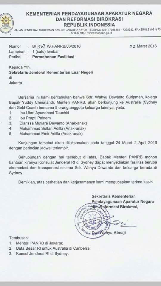 Sebelumnya terkait Surat Permohonan Fasilitasi telah dibantah oleh MenPANRB, Yuddy Chrisnandi bahwa ia tidak mengetahui dan tidak menginstruksikan terkait surat tersebut. Jadi dia berlepas diri dari Surat Katebelece dari koleganya Sdr. Wahyu Dewanto Suripman beserta lima anggota keluarganya yang akan berkunjung ke Australia 24 Maret-2 April 2016.