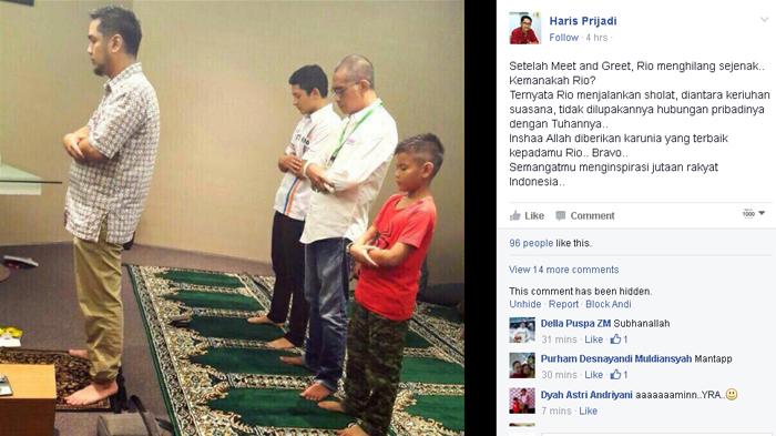 Seorang netizen bernama Haris Prijadi berhasil mendapatkan momen itu ketika Rio sedang menjalankan sholat berjamaah dan mengunggahnya di akun facebook. “Setelah Meet and Greet, Rio menghilang sejenak.. Kemanakah Rio? Ternyata Rio menjalankan sholat, diantara keriuhan suasana, tidak dilupakannya hubungan pribadinya dengan Tuhannya.. Inshaa Allah diberikan karunia yang terbaik kepadamu Rio.. Bravo….Semangatmu menginspirasi jutaan rakyat Indonesia. ” tulis Haris yang mendapatkan like dan menjadi viral di sosmed.