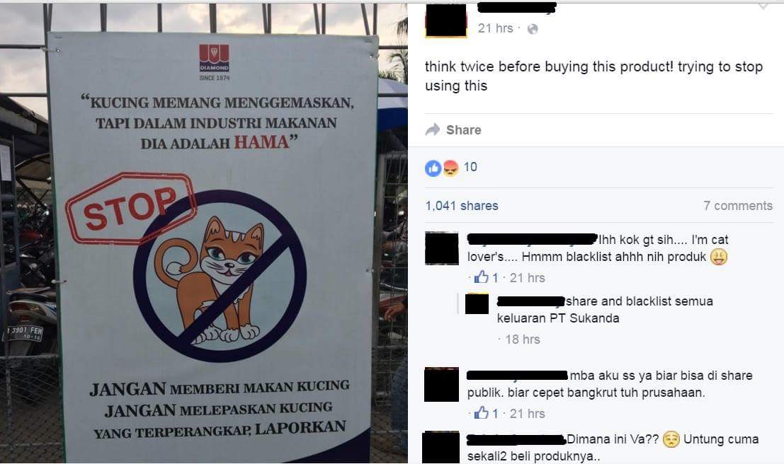 Adalah netizen Imelda Ringo yang menjelaskan salah paham mengenai papan peringatan tersebut. Penjelasan ini diposting dalam akun Facebook-nya pada hari Sabtu, 30 April 2016. “Saya pernah bekerja di sebuah industri makanan. Saya dan teman2 di kantor tersebut adalah penyuka kucing. Sungguh. Teman2 suka memelihara kucing. Jadi begini, teman2 ….. PT. Sukanda Jaya (Diamond) ini bergerak di bidang INDUSTRI MAKANAN. ” ujarnya mengawali penjelasannya