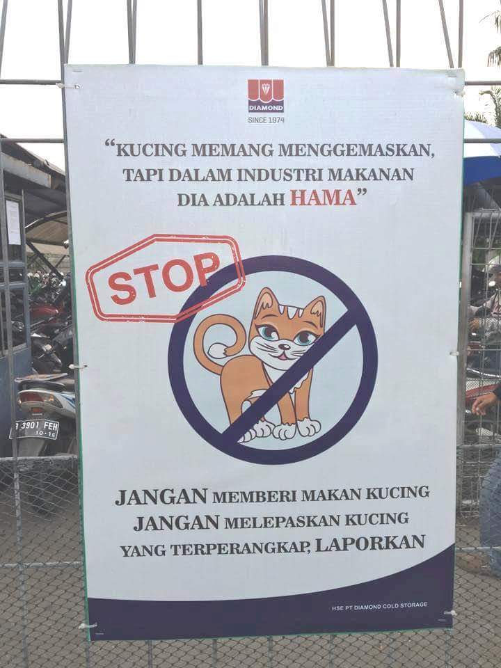 Beredar secara viral sebuah papan peringatan dari sebuah pabrik yang menjelaskan larangan kucing masuk dalam area pabrik. “Kucing memang menggemaskan tapi dalam industri makanan dia adalah hama.Jangan memberi makan kucing, Jangan melepaskan kucing, yang terperangkap, laporkan” demikian sebuah papar peringatan yang bergambarkan kucing dicoret dengan tulisan STOP. Nah tulisan inilah yang menimbulkan kehebohan publik karena dirasa tidak memiliki rasa perikehewanan. Biar gak gagal paham mari cermati penjelasan berikut kawans…