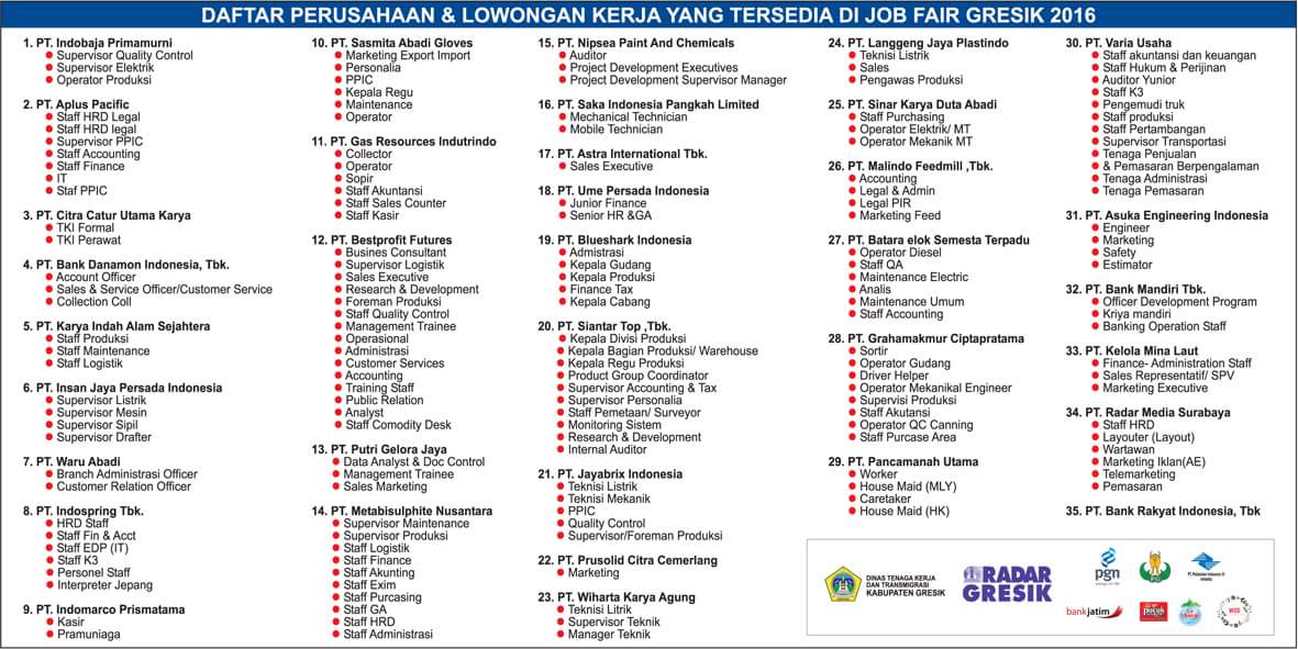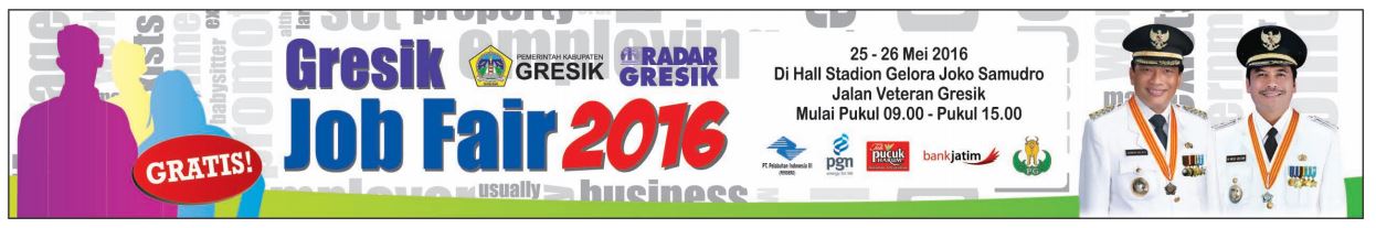 Bagi mantemans yang cari lowongan pekerjaan mungkin even Job Fair Gresik 2016 ini bisa dijadikan pilihan. Even temu pencari kerja dan perusahaan ini digelar tanggal 25 – 26 Mei 2016 di Gelora Joko Samudra. Letak Gelora Joko Samudra berada di Jalan Veteran Gresik masbrow. Sekitar 35 perusahan lokal dan nasional berpartisipasi dalam gelaran ini.