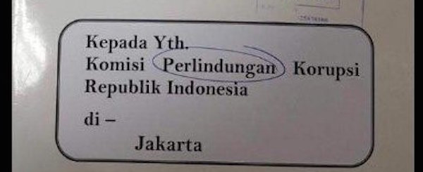 Heboh salah ketik penulisan kepanjangan KPK di kolom surat yang dibuat oleh Kementerian Dalam Negeri. Undangan yang dibuat oleh staf outsourcing bernama Adi Feri di Direktorat Jenderal Politik dan Pemerintahan Umum Kemendagri membuat kehebohan publik ketika menulis “Komisi Perlindungan Korupsi” untuk KPK dari yang semestinya Komisi Pemberantasan Korupsi (KPK). Sebuah sindiran satire?