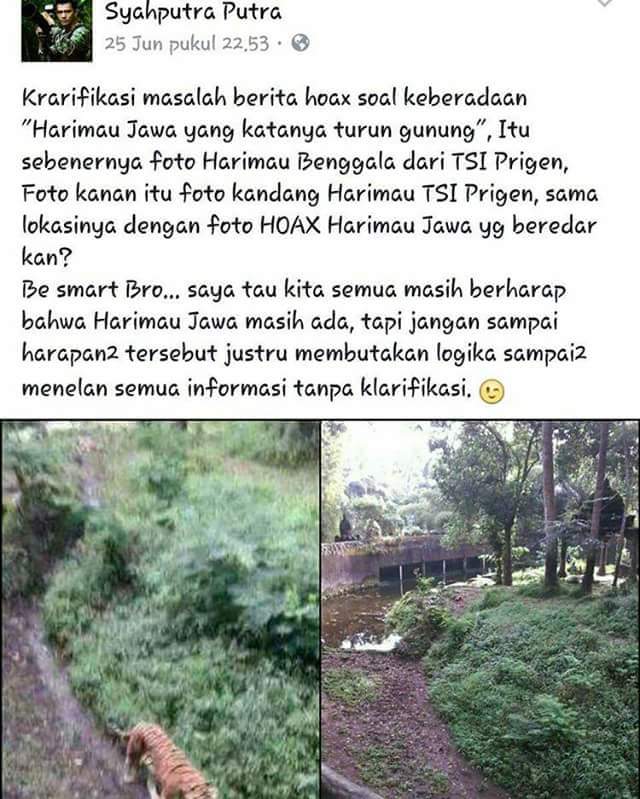 Harimau Jawa, Javan Tiger atau Panthera tigris sondaica secara kajian akademis dinyatakan punah tahun 1980an. Hal ini menyusul saudara antar pulaunya yakni Harimau Bali yang lebih duluan punah sedangkan Harimau Sumatra masih bertahan hingga kini. Kepunahannya disebabkan karena habitat/ekosistem yang terdesak, perburuan besar-besaran dan pembunuhan oleh warga yang geram karena memangsa ternak mereka. Nah begini tanggapan netizen mengenai jepretan foto yang diduga Harimau Jawa. Banyak yang berharap bahwa itoe betoel adanja namun ada juga yang menyangsikan bahwa itu merupakan hoax.