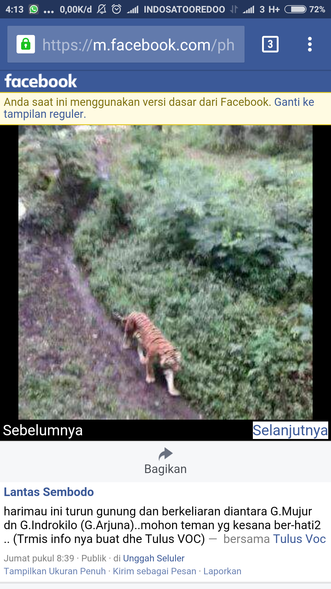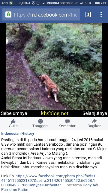 Beredar sebuah jepretan foto diduga Harimau Jawa yang diunggah ke laman Facebook oleh netizen. Foto Harimau itu diupload akun Lantas Sembodo bersama Tulus Voc pada Jumat tanggal 24 juni 2016 . “Harimau ini turun gunung dan berkeliaran diantara G.Mujur dn G.Indrokilo (G.Arjuna)..mohon teman yg kesana ber-hati2 .. (Trmis info nya buat dhe Tulus VOC)” ujar Lantas dalam kepsen dalam foto tersebut? Benarkah Harimau Jawa masih ada?.