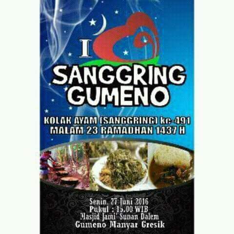 Kolak Ayam / Sanggring merupakan tradisi khas malam ke-23 Ramadhan di Masjid Jami Sunan Dalem, Gumeno, Manyar, Gresik. Tradisi ini sudah berjalan turun temurun hampir 5 abad silam. Tidak hanya semacam kolak saja namun kolak ayam ini dipercaya oleh warga setempat sebagai obat yang menyembuhkan dari berbagai penyakit. Nah sore nanti tanggal 27 Juni 2016 bertepatan dengan malam 23 Ramadhan 1437 H maka tradisi ini akan dilakukan. Yuuk diserbu masbrow dan mbaksis….