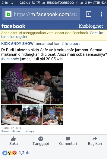 “Dr Budi Laksono bikin Cafe unik yaitu cafe jamban. Semua makanan dihidangkan di closet. Anda mau coba sensasinya?#kickandy jumat,1 juli pkl 20.05,wib ” ujar KICK ANDY SHOW sambil melampirkan 7 foto cafe Jamban diatas. Nah berikut tanggapan netizen terkait rencana kick Andy show yang akan mengangkat tema diluar kebiasaannya. Tentunya komeng yang ada menimbulkan pro dan kontra kawans….