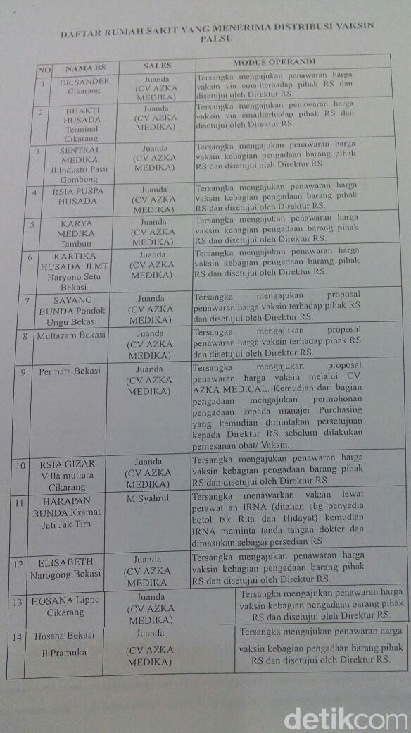 Berikut daftar 14 rumah sakit yang terbukti menggunakan vaksin palsu menurut temuan Bareskrim Mabes Polri: