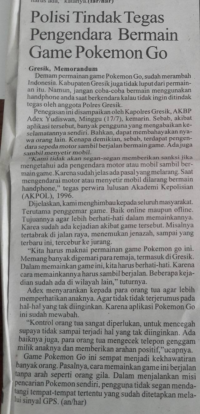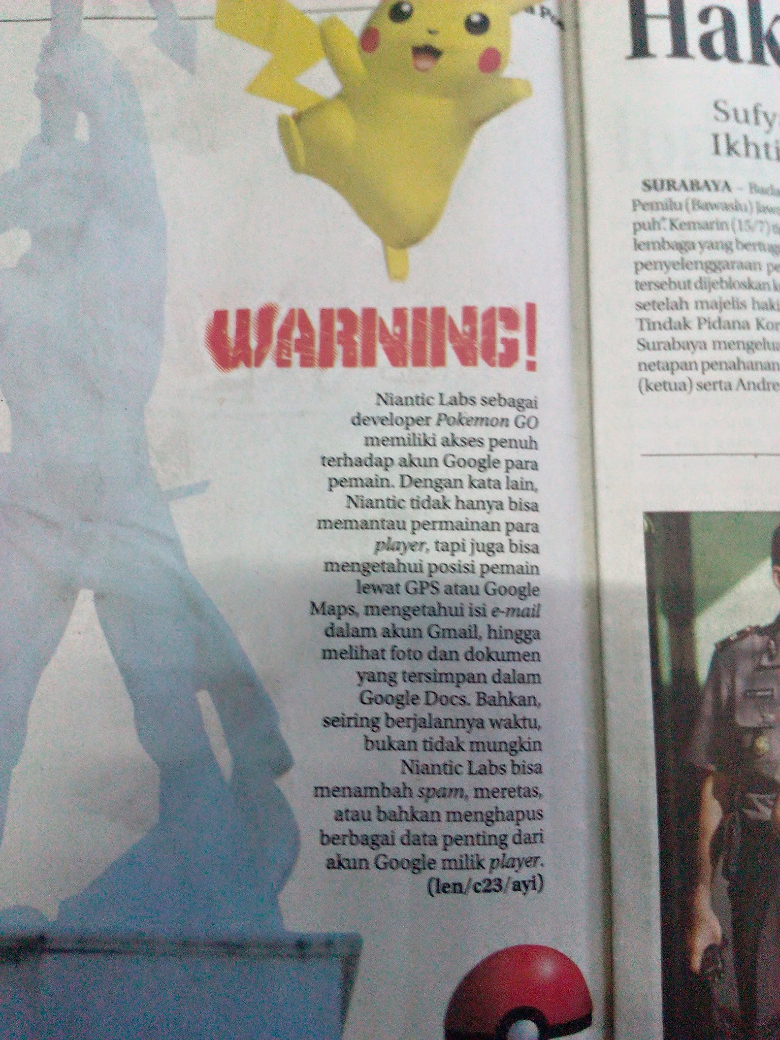 Meskipun sempat mengalami Server Down karena serangan dDos, Pokemon Go tetap menjadi game yang menarik perhatian sejagad. Game yang berasal dari Nintendo ini dimainkan semua orang dari segala usia dan latar belakang yang berbeda. Kekewatiran pun menyeruak terkait deman game pokemon ini mulai dari serangan malware pada gadget, keamanan atau sekuritas pada gadget hingga keselamatan bagi pemainnya. Selain itu juga terdapat kekawatiran-kewatiran yang lain. Nah berikut kliping dari koran masbrow dan mbaksis…