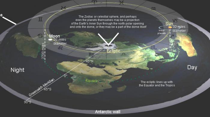 - Meyakini bahwa Bumi begitu spesial sehingga walaupun banyak benda langit berbentuk bulat, Bumi berbentuk datar layaknya piringan. Di mana Lingkaran Arktik berada di pusatnya, sementara Antartika, sebuah dinding es setinggi 150 kaki atau 45,7 meter, berada di pinggirannya. Mereka mengklaim, NASA mempekerjakan sejumlah orang untuk menjaga ketat dinding es ini, mencegah siapapun memanjatnya dan terjatuh dari piringan bumi.