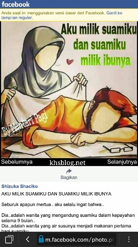 Sebuah tulisan Shizuka Shaciko dilaman facebooknya beberapa waktu lalu. Tulisan berjudul AKU MILIK SUAMIKU DAN SUAMIKU MILIK IBUNYA. Monggo dibaca sendiri yah…