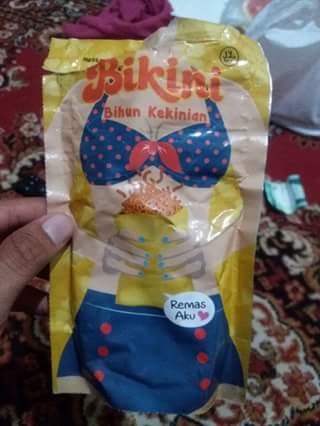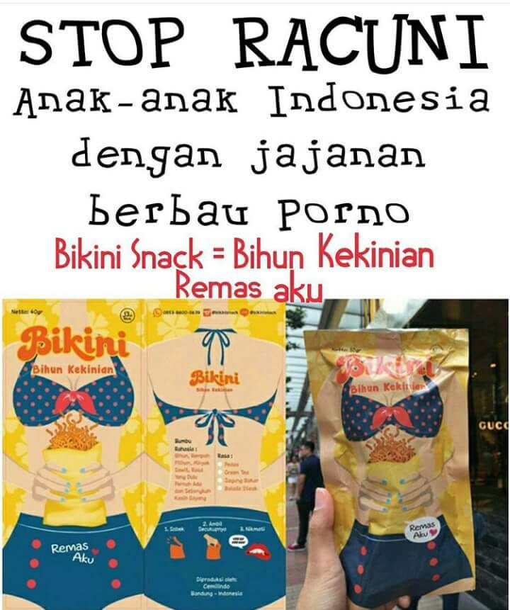 Ditemukan sebuah jajanan anak yang bernama Bihun Kekinian yang disingkat Bikini. Tidak cukup dengan tulisan namun juga digambarkan pula bentuk dari bikini tersebut. Terlihat seperti seorang perempuan yang memakai bikini dengan memegang jajanan mie bihun ini. Parahnya ada tulisan provokatif dibawahnya yakni Remas Aku”. Anehnya ada logo tulisan “halal” pisan :-(.