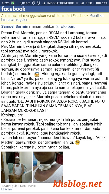 Sebenarnya iklan di TV atau koran sudah menjelaskan dampak negatif dari rokok ini namun lebih kepada para perokok aktif. Namun postingan Samuel Sormin di laman facebooknya tanggal 10 Juni 2016 silam menjelaskan bahayanya perokok pasif. Monggo disimak