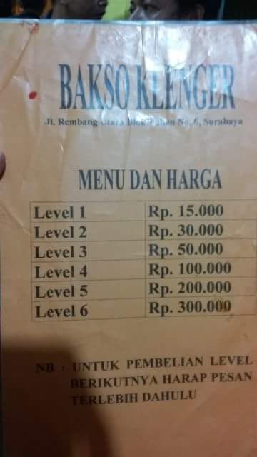 Dilihat dari menu bakso yang ada di level 1 harganya cuma Rp. 15.000 sedangkan hingga level 6 mencapai Rp. 300.000 . Nah bagi yang mau makan level diatas 6 mesti inden alias pesan dahulu masbrow dan mbaksis. Pentol nya segedhe gaban gans…… xixixiixi. Kalau perut kuat silahkan dijabanin sendiri tetapi kalau menyerah ya mending rame-rame untuk menyantap nya 😂