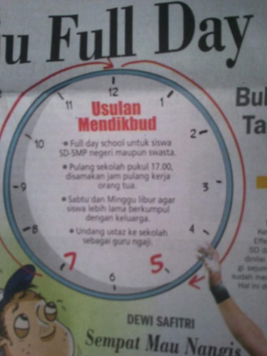 full day scholl adalah gagasan yang gak pas sama sekali menurut saya sbg warga negara indonesia. ibarat hasil satu macam anak mungkin lebih pandai tetapi korban 6 macam. salah satu korbannya pendidikan agamanya gak punya tempat dan waktu. anak malah jadi kecapaian pikiran. dst. saya yakin orang orang pintar di indonesia bisa menterjemahkannnya.