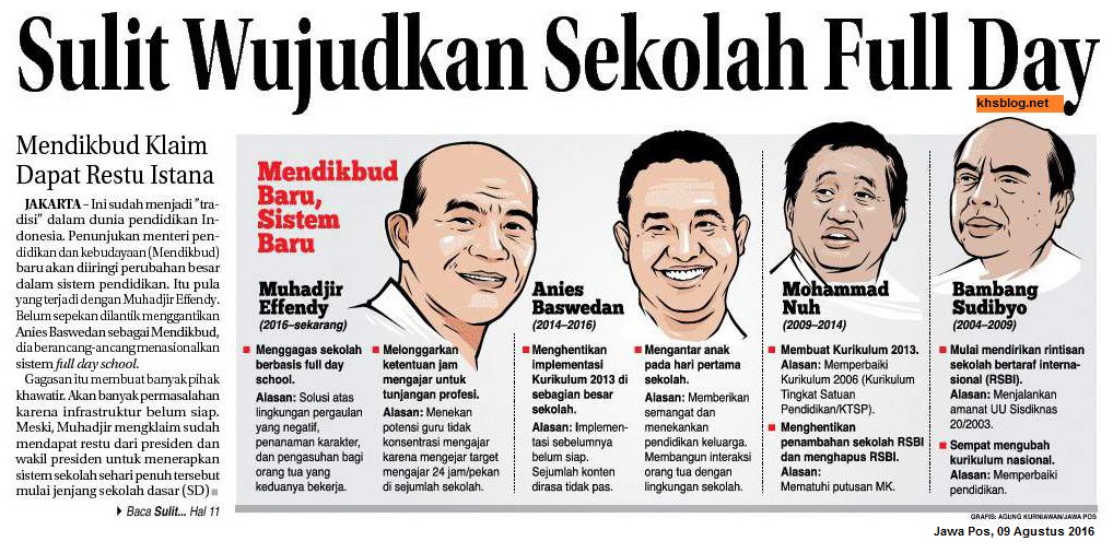 Sudah menjadi tradisi di Indonesia bila menteri baru pasti ada kebijakan baru. Termasuk dalam dunia pendidikan dengan bergantinya Menteri Pendidikan dan Kebudayaan. Sejak era SBY dengan Mendikbud Bambang Sudibyo (2004-2009) dan Muhammad Nuh (2009-2014) hingga Era Jokowi dengan Mendikbud Anies Baswedan (2014-2016) dan Muhadjir Effendy (2016-skrg). Dan yang terbaru adalah gagasan full day school alias Sekolah Sehari Penuh dari Muhadjir Effendy. Begini tanggapan Netizen mantemans…