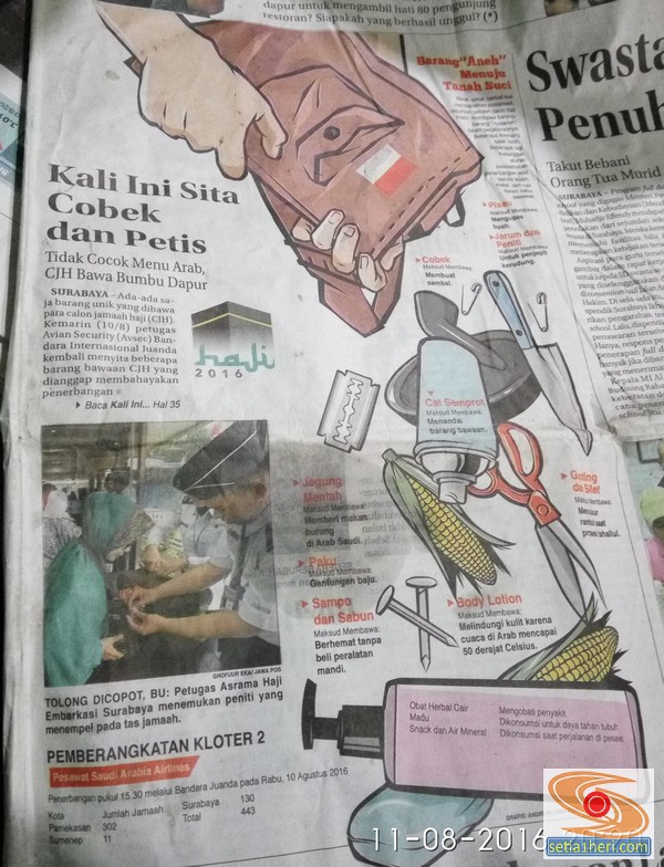 Ada temuan barang-barang aneh, nyleneh dan ngakak yang disita oleh petugas Avian Secuirty Bandara International Juanda (10/8) ketika memeriksa para CJH (Calon Jamaah Haji). Meskipun sudah berulang kali dilakukan sosialisasi namun masih ditemukan barang-barang aneh, tak lazim dan melanggar aturan keselamatan penerbangan seperti benda cair, metal dan tajam (probihited items). Yuuk diintips apa saja barang-barang tersebut…hehehe