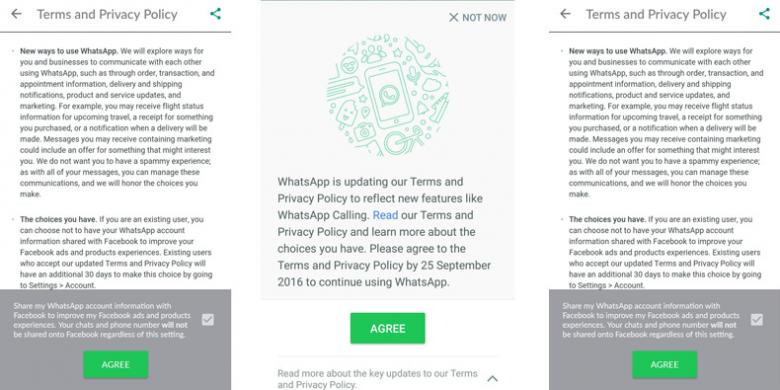 Mungkin mantemans pernah menerima pesan mengenai syarat pemakaian dan kebijakan privasi WhatsApp. Jangan serta merta “agree” terhadap kebijakan baru tersebut karena ada satu klausul mengenai data milik pengguna, yang terdiri dari nomor telepon dan pola tingkah laku penggunaan aplikasi akan dishare ke induknya yakni facebook. Untungnya kita bisa menolak alias disagree terhadap ketentuan ini.