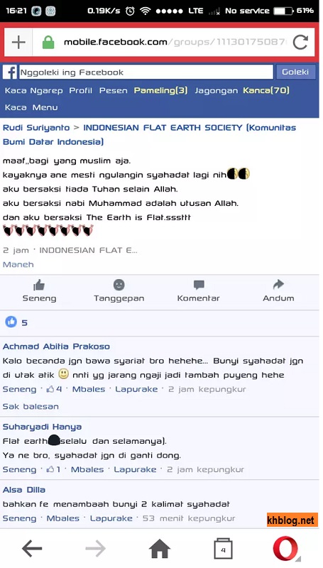 Diskursus bumi bulat atau bumi datar memang hangat-hangat sehangat tahi ayam…xixixi. Semua pendukung dan fansnya masing-masing teori mengajukan argumen, data dan fakta bahkan tak jarang juga ada debat kusir. Dan kadang semuanya membawa-bawa agama dengan segala tafsirannya meskipun diskursus flat earth dan globe earth murni teori pengetahuan masbrow dan mbaksis. Nah berikut ada seorang member di Indonesia Flat Earth Society di Indonesia yang bawa-bawa Syahadat pula…weleh-weleh.