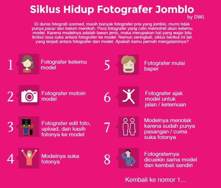 Jomblo memang tidak mengenal latar belakang pekerjaan. Jomblo bisa hinggap dimana aja termasuk kalangan fotografer alias juru potret. Yah namanya aja jomblo pasti timbul niatan untuk mengakhiri masa jomblonya. Berhubung jadi fotografer tentu objek untuk pedekate adalah model yang ada didepan lensa kamera nya. Kira-kira beginilah siklus hidup jomblo fotografer yang sedang apes alias tidak beruntung.