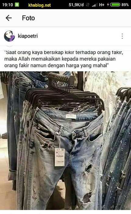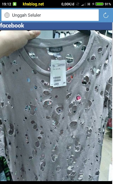 Sebuah gambar kaos oblong bin bolong-bolong lewat di grup media sosial KHS. Entah ini beneran fesyen ataukah sekedar editan sotoshop lelucon KHS tidak mengetahui secara pasti. Terpampang sebuah gambar kaos oblong merk dividedi dengan bentuk lubang-lubang, compang-camping dan terlihat lusuh bin kusam karena menyatu dengan warna abu-abu. Biasanya kaos semacam ini sering dipakai terus-terusan alias mbahringgo ( diumbah-kering-dienggo) dicuci kering dipakai lagi. Lihat banderolnya terpampang angka Rp.349.900….weladalah….