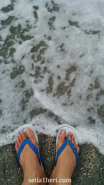 KHS pun terpikat pesonanya untuk sedikit merasakan sapuan bening airnya. Kaki-kaki yang lelah inipun terbasuh sempurna hingga basah celana yang menutupinya. Terasa dingin dan bahagia karena bisa jadi kesempatan ini tidak bisa terulang kembali. Yah… begitoelah kawans cerita sore ini bermain bersama ombak dipinggir pantai.