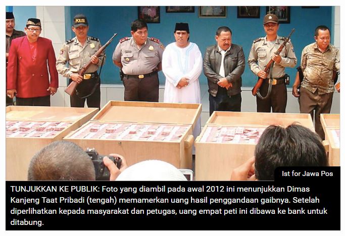 Pasca penangkapan pimpinan Padepokan Dimas Kanjeng Taat Pribadi kamis (22/9) silam sejumlah kasus turut mencuat. Direktur Tindak Pidana Umum Bareskrim Polri Brigjen Agus Andrianto mengungkapkan, Kanjeng Dimas tidak hanya dilaporkan ke Bareskrim Polri atas dugaan penipuan. Pemilik Padepokan Kanjeng Dimas itu juga dilaporkan atas kasus Tindak Pidana Pencucian Uang (TPPU). Pengikutnya tersebar di nusantara diklaim hingga 20 ribu orang termasuk tokoh nasional Marwah Daud Ibrahim. Nah terlepas dari itu, berikut 7 fakta uang ghaib dari Dimas Kanjeng Taat Pribadi.