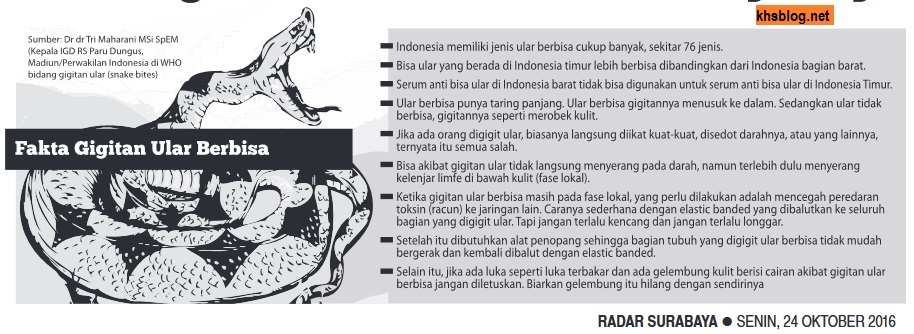 Berikut KHS rangkum dari Radar Surabaya edisi Senin, 24 Oktober 2016 mengenai Penanganan Gigitan ular berbisa di Indonesia