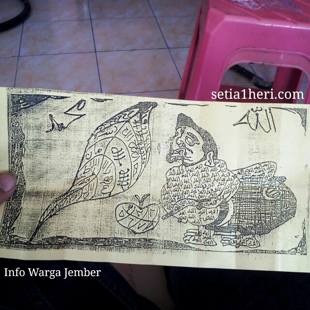 Entah ini dikatakan jimat, rajah ataukah hanya sekedar tulisan arab. Sebuah gambar dengan tulisan arab berbentuk Semar diterima oleh netizen di grup Info Warga Jember. Menurutnya dia dikasih selembar kertas bergambar tulisan arab tersebut pasca membantu orang yang bersangkutan. Dan begini penampakan jimat bergambar Semar tersebut.