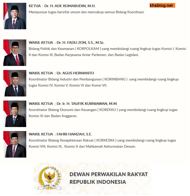 - DPR : Ketua : H. Setya Novanto, S.E. (Menjabat sejak 2 Oktober 2014 – Desember 2015). Ketua : Dr. H. ADE KOMARUDIN, M.H.; (Menjabat sejak 11 Januari 2016). Ketua : H. Setya Novanto, S.E. (Menjabat kembali per tanggal 30 November 2016). Ketua : H. Bambang Soesatyo, SE. M.BA (Menjabat sejak 15 Januari 2018). Wakil Ketua :