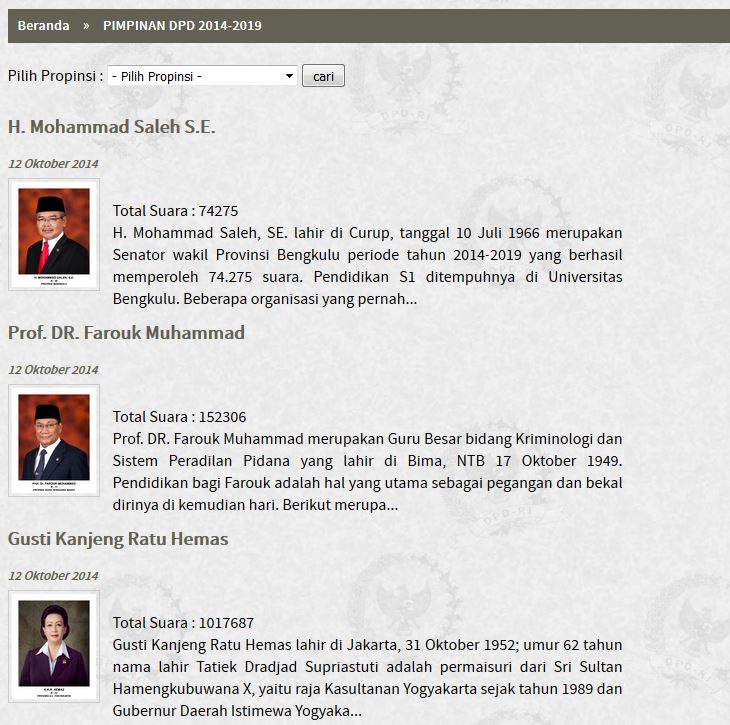 - DPD : Ketua : H. Irman Gusman, S.E., MBA. (Menjabat sejak 2 Oktober 2014-September 2016). Ketua : H. Mohammad Saleh S.E. (menjabat sejak 11 Oktober 2016). Wakil Ketua: