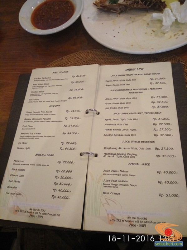 Butuh waktu sekitar 15 menit untuk menikmati hidangan bebek goreng ini. Memang sih menurut KHS bebeknya biasa saja namun sambalnya yang begitu spesial kawans. Kang bukane sampeyan kolesterol tinggi kok berani beraninya makan?…maaf khilaf…. hehehe. Jangan kwatir, daftar menu minumannya ada menu jus menurunkan kolesterol lho yah… hehehehe.
