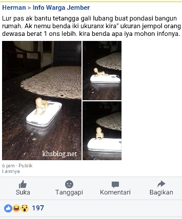 “Lur pas ak bantu tetangga gali lubang buat pondasi bangun rumah. Ak nemu benda iki ukuranx kira” ukuran jempol orang dewasa berat 1 ons lebih. kira benda apa iya mohon infonya ” ujar Herman di gup Info Warga Jember beberapa waktu lalu.