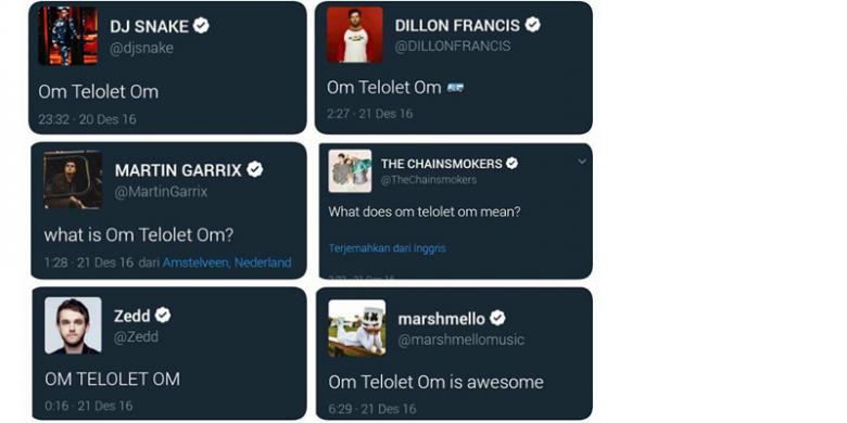 Pada Selasa (20/12/2016) malam hastag #telolet menjadi trending topic Twitter . Selebritas dunia seperti DJ Snake, Oliver Heldens, Hardwell, Zedd, hingga Martin Garrix beramai-ramai mengicaukan frasa “om telolet om”. “Telolet mengajarkan kita bahwa bahagia itu nyatanya simple. Makasih #telolet :))” tulis akun @infoseni_. “Fenomena Om #telolet Om, mungkin tercipta karena pemerintah gagal menciptakan hiburan buat rakyat, dan tv sudah semakin basi untuk dilihat,” tulis akun @Kikngiang