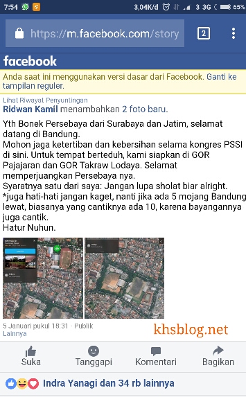 Kongres PSSI baru akan digelar tanggal 8 Januari 2016 besok namun para Bonek Mania pendukung Persebaya sudah mulai bergerak ke Bandung. Tujuan Bonek ke kongres PSSI untuk mengawal Persebaya masuk dalam liga persepakbolaan tanah air terutama divisi utama. Nah perjuangan Bonek ini juga disambut oleh Ridwan Kamil, walikota Bandung yang memberikan sambutan hangat via laman facebooknya tanggal 5 Januari 2017 kemarin.