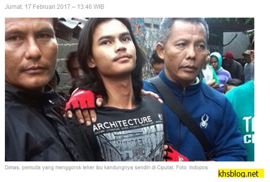 Seorang pemuda tega menghabisi nyawa ibu kandungnya sendiri di Ciputat, Tangerang Selatan. Adalah Dimas (18) yang diduga depresi sehingga tega menggorok ibunya Titin Nurbaiti (50) dengan pisau dapur hingga tewas. Penyebabnya adalah hal sepele yakni korban disuruh ibunya mematikan kompor setelah digunakan menyulut sepotong rokok. Weladalah….