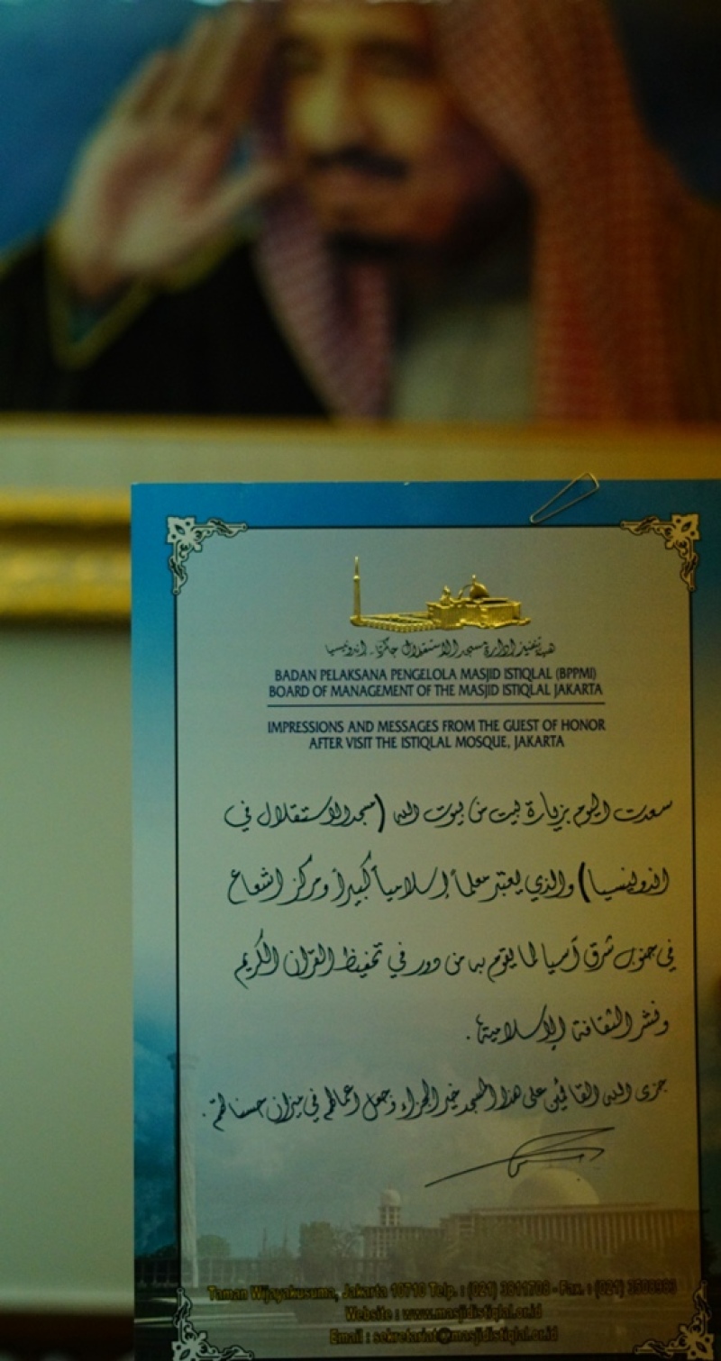 “Saya sangat berbahagia hari ini dengan berkunjung di salah satu rumah dari rumah Allah yaitu Masjid Istiqlal di Indonesia, yang dianggap sebagai tempat belajar Islam yang besar, dan menjadi pusat syiar Islam di Asia Tenggara dalam kajian dan hafalan Al-Quran serta penyebaran kebudayaan Islam.