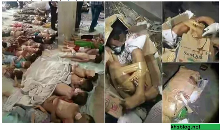 Dalam foto juga memperlihatkan sejumlah jasad anak-anak disusun dan beberapa diantarnya masih di dalam kardus diikat dengan selotip.