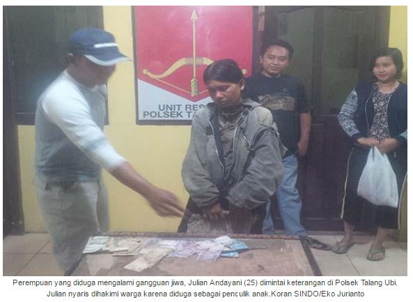 - Maraknya isu penculikan anak, nyaris membuat Julian Andayani (25), dihakimi massa karena gerak-geriknya yang mencurigakan. Perempuan asal Sumatera Utara (Sumut) ini dicurigai karena berjalan tanpa tujuan menyisiri sepanjang jalan Desa Talang Bulang, Kecamatan Talang Ubi, Kabupaten Penukal Abab Lematang Ilir (PALI), Palembang, Senin (20/3/2017) malam.(sindonews.com)