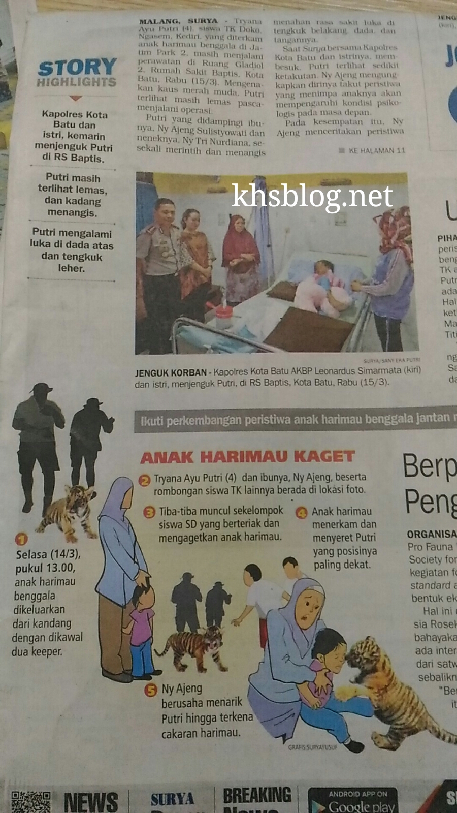Korban bernama Triana Ayu Putri (5) siswi TK Ngasem, Kecamatan Dhoko, Kabupaten Kediri yang sedang liburan bersama di Jatim Park 2 di Batu bersama ibu dan neneknya pada Selasa (14/3/2017). Sekitar pukul 14.00 WIB korban henda foto bersama dengan seekor anak harimau Bengala warna putih yang masih berusia tujuh bulan ini.