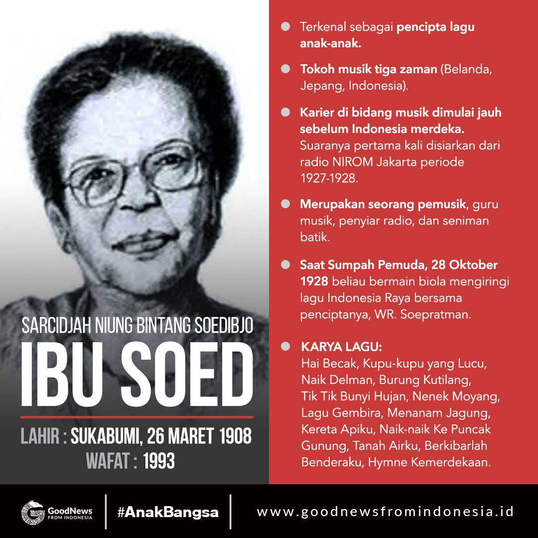 Saridjah Niung atau lebih akrab dipanggil Ibu Soed merupakan tokoh seniman musik tanah air. Ulang tahunnya yang ke 109 diperingati oleh Google Doodle pada hari Minggu (26/3) kemarin. Pernah menyanyikan lagu Hai Becak, Burung Kutilang, Kupu-kupu dan Tik Tik Bunyi Hujan? Beliaulah yang menciptakan lagu abadi tersebut hingga kini. Karya beliau tentang lagu anak-anak telah menjadi legenda hingga kini. Siapakah Ibu Soed ini?